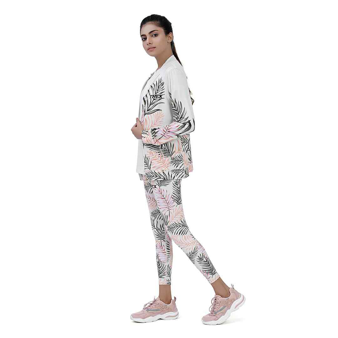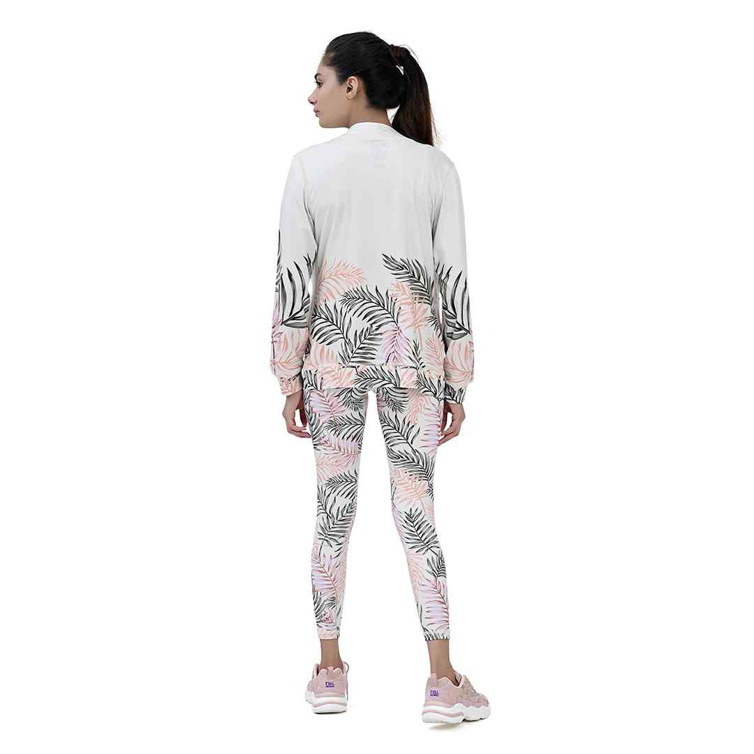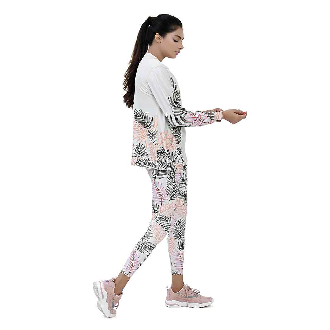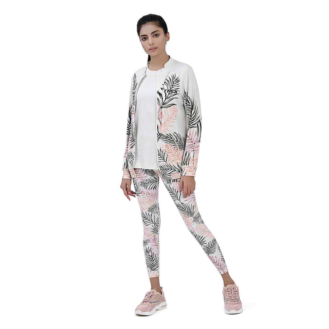 Get an extremely sporty attire with awesome digital printed design! Shine, glow and feel confident with Leafy Print Sports Jacket. The smart blend of polyester and spandex not only guarantee durability but a fresh outlook of the attire. It is tailored to fit in your body. The white smooth zipper on the white jacket not only looks good but also works great.